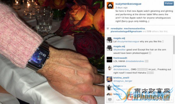 Apple Watch实物亮相:戴手表的这个人是谁? 备受果粉们期待的Apple Watch至今没有迎来一个确切的发布日期,但这并没能阻挡人们去发掘它存在的痕迹。周一的时候,MacRumors论坛的k3ith分享了一张来自Vogue国际编辑Suzy Menkes的Instagram账户的图片,内容是一只摆放在餐桌上、但却赫然戴着一块Apple Watch的左手腕。