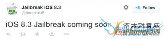 iOS8.3越狱要来了:iOS8.4将是最后版本 iOS 8.3推送之后,苹果一口气修复了39个安全漏洞,国内太极团队发现的越狱漏洞也被修补,越狱工具一直没有消息。此前,越狱大神已经放出一段iOS 8.4测试版iPhone 6 Plus越狱视频,我们不禁要问,iOS 8.3越狱到底啥时候能来呢?今天,另一位越狱大神limera1nJB在Twitter上放出消息称,iOS 8.3越狱即将到来。limera1nJB并未透露细节,所以是否为完美越狱还不得而知。