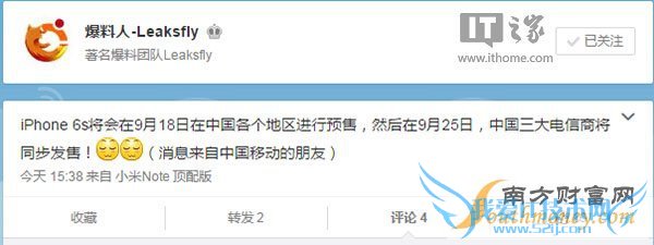 按照今年苹果对中国市场的重视程度来说,中国被选做首发国家之一的可能性很大,但是也并不排除一些客观因素的干扰导致预售时间推后。现在,微博上有网友@爆料人-Leaksfly首次曝光了国行版iPhone6s/6s Plus的发售时间。