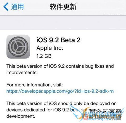 如果是之前已经安装了开发者版本iOS9.2 beta的用户,现在可以直接进入设置查看软件更新升级,拥有开发者账号的用户也可以到苹果官方的开发者人员中心网站进行下载。需要注意的是,升级后将无法还原到早期版本的iOS系统。