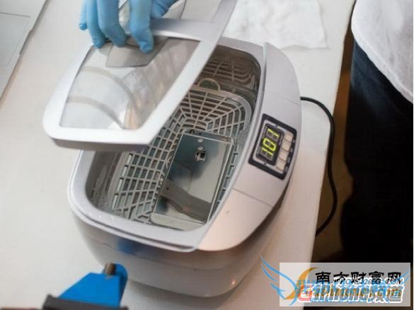 然后,需要将后盖放在超声波清洗设备中完全清洁,才能进行下一步的抛光操作。手机后盖必须是完全干净的,如果落上灰尘或是微粒,会导致镀金涂层不平整,显然没有一个用户会为其买单。