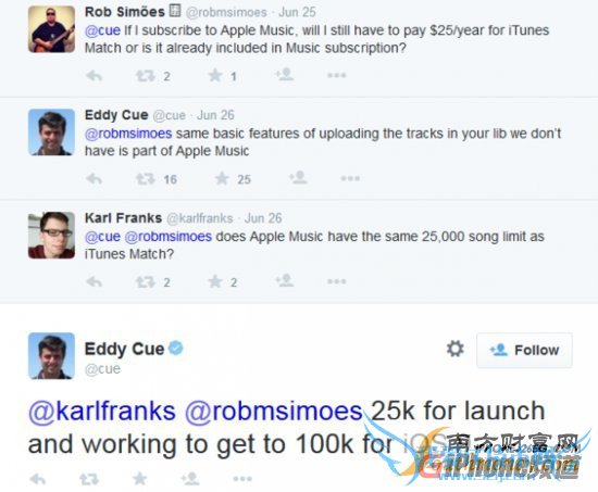 iOS9的更新将在系统中增添许多新功能,随着功能的不断曝光,关于iTunes Match服务的消息也漏出了水面。日前,苹果高管Eddy Cue在Twitter上回答网友的提问时提到,iTunes Match用户在iCloud上储存音乐的封顶值将从2.5万首提升至10万首,并且所有的Apple Music用户都能享受到iTunes Match服务。