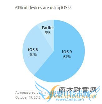 iOS9升级率已超60% iOS9越狱/iPhone6S谁之功? 苹果在北京时间今天凌晨发布了 iOS 9.1,意在解决此前在 iOS 9.0-9.0.2 当中用户所反映的一系列系统问题。我们不知道本次更新是否真的可以有效减少用户的吐槽声,但升级到 iOS 9 的人已经越来越多。苹果近日公布了 iOS 系统安装比例的最新数据,其中显示 iOS 9 的安装率达到 61%,而 iOS 8 安装率已剧减至 30%。