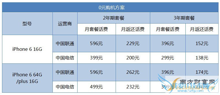 以多数合约用户通常会选择的“预存话费送手机0员购机”合约方案为例,以16GB版本iPhone 6 为例,中国联通提供的0元购机方案有“两年期596元套餐0元购机”方案和“三年期396元0元购机”方案。中国电信提供的0元购机方案有“两年期399元套餐0元购机”方案和“三年期299元0元购机”方案。