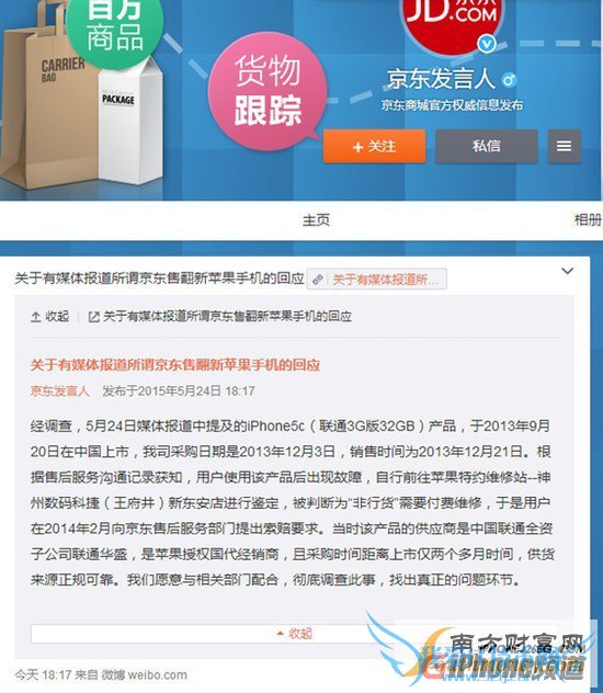 经调查,5月24日媒体报道中提及的iPhone5C(联通3G版32GB)产品,于2013年9月20日在中国上市,我司采购日期是2013年12月3日,销售时间为2013年12月21日。根据售后服务沟通记录获知,用户使用该产品后出现故障,自行前往苹果特约维修站--神州数码科捷(王府井)新东安店进行鉴定,被判断为“非行货”需要付费维修,于是用户在2014年2月向京东售后服务部门提出索赔要求。当时该产品的供应商是中国联通全资子公司联通华盛,是苹果授权国代经销商,且采购时间距离上市仅两个多月时间,供货来源正规可靠。我们愿意与相关部门配合,彻底调查此事,找出真正的问题环节。
