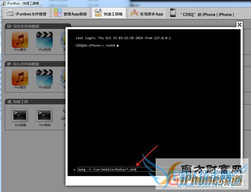 点击“快捷工具箱”后再点击高级工具的“SSH终端”,注意第一次连接时会提示你修改原始密码,不建议i-Funbox来修改,怕到时候不知道密码,可以以后再自行修改