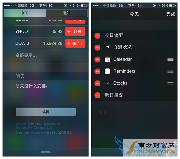 在 iOS 7 发布之后,小编就有一个疑问,究竟 iOS 7 中通知中心的“全部”和“未读通知”的独立存在的意义是什么。而在 iOS 8,苹果也似乎采用了用户的建议,将上述两个合二为一,变成“通知”。在 iOS 8 中,每一个项目的分类更加明显,通过加深每个分类的颜色来让视图更为直观。而顶部的编辑按钮,可以让你直接在通知中心里对不想提醒的通知进行移除,例如股票,也可以根据喜欢调整先后顺序。