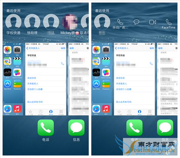 苹果这次其中一个大受称赞的升级就是增加了信息的快速回复,当信息弹出的时候,无论是在主屏还是在锁屏界面,你都可以对其进行快速回复。相信不少看了 WWDC 视频的用户,都知道如何进行操作,在主屏的时候当推送消息弹出,都可以下滑进行快速回复,值得一提的是,信息功能现在可以发送语音信息了,只要对方拥有苹果设备,通过一个向上滑动的手势就可以免费发送(经过测试,目前向 iOS 7 设备发送语音,也可以进行播放)。此外还增加了群聊模式。不要忘了这次在多任务切换界面的改动,iOS 8 在应用切换预览卡片的上方放入了最近联系人的“大头贴”,这也是另一个可以快速发送信息的途径,只要点击联系人的头像,就可以进行快速拨号,发送短信,FaceTime 视频等。