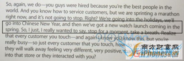 苹果零售主管 Angela Arhendts 日前向零售员工发送视频讲话,根据消息人士向媒体提供的文字记录版本,Angela Arhendts 解释并且要求苹果的零售员工储存精力,为接下来的购物假期做准备。 她说,“我们面临感恩节和圣诞节,我们面临中国春节,然后我们在春天有新手表上市。”