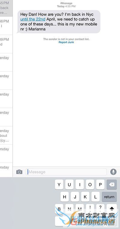 iOS8.3新功能 及时报告iMessage垃圾短信 经常收到来自 iMessage 的垃圾短信已经成为 iOS 用户的一大烦心事,但在 iOS 8.3 中出现的一个改进可能会改善这一问题。当不在你联系人列表的人给你发送 iMessage 的时候,在 iOS 8.3 中会出现一个选项让你能够及时报告这条短信息为垃圾短信。正如你在截图中看到的一样,你在该条信息下方将会看到一个“Report Junk”(报告为垃圾信息)的选项。这个功能最初是由一位 Reddit 用户发现的。而这个选项仅限于 iMessage。