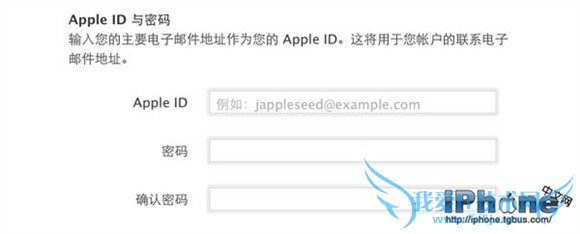 3、第二部分是Apple ID与密码,Apple ID可以视作我们在网络上的一个用户名,必须是以邮箱格式,如QQ邮箱、163邮箱等。这个邮箱建议使用稳定的邮箱,因为日后可以通过这个邮箱来找回Apple ID的密码。