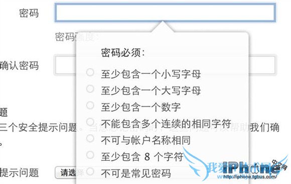 4、为了安全起见,当前注册苹果ID时要求密码必须满足一定的复杂要求,下图就是Apple ID密码格式的具体要求: