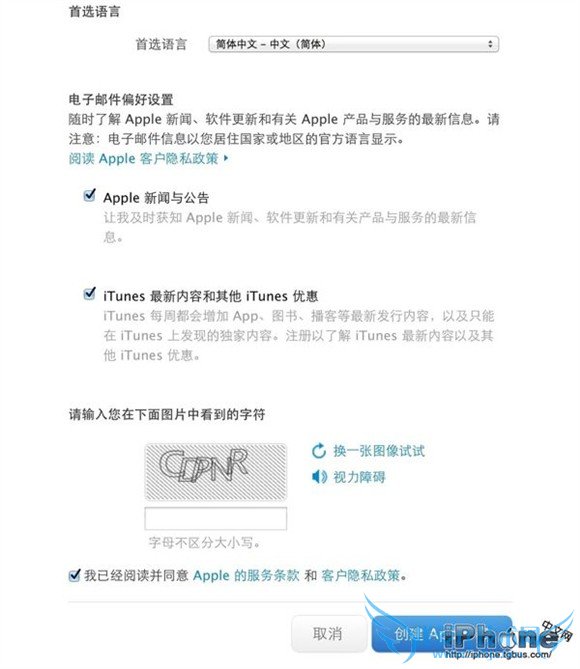 9、第六部分中,可以选择首选语言,是否要让苹果向用户的邮箱发送一些苹果产品的新闻,随后输入验证码,勾选同意协议,最后点击“创建Apple ID”按钮就可以了。