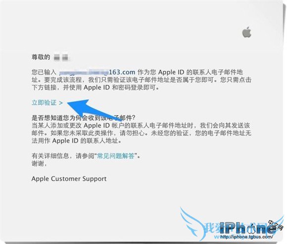 10、创建成功以后,系统会提示我们一封用于验证我们注册Apple ID时的电子邮件已经发出。这时打开刚刚输入的邮箱,找到一封来自Apple的电子验证邮件,点击邮件内容中的“立即验证”链接,如下图所示。