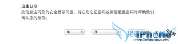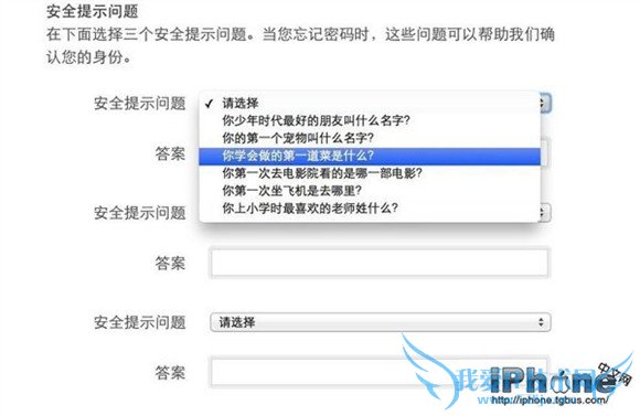 5、第三部分是安全提示问题,这个的作用是当用户的帐号被盗,或是忘记了Apple ID密码时,可以用它来恢复账号以及密码。大家可以根据自己记忆深刻的问题来选择相应的安全提示问题。