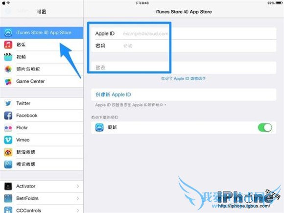 14、当我们注册好了一个Apple ID以后,接下来要做的就是用这个ID在苹果的设备上登录。这里以iPad为例,我们在设置列表中找到“iTunes Store和App Store”选项,输入我们注册好的Apple ID和密码,等待系统验证成功,就可以正常使用了。