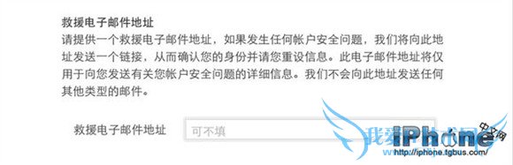 7、第四部分是救援电子邮件地址,这个是可选项(可以填写也可以不填写),也是填写一个电子邮件地址。当用户忘记了自己原来注册的邮箱密码,如果用电子邮件来恢复Apple ID时,就可以填写这个救援电子邮件地址了。