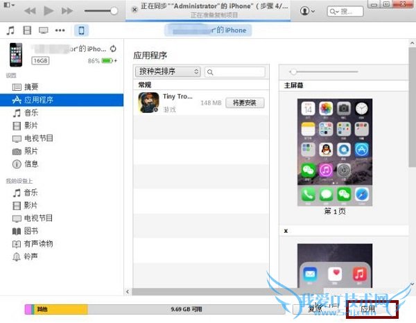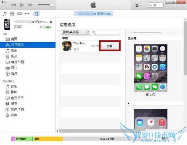 第二步,应用下载完成后,在iPhone管理页面,应用程序栏目中,点击刚下载应用的右侧的“安装”按钮,即可显示“将要安装”。然后点击右下角的“应用”按钮,开始同步。