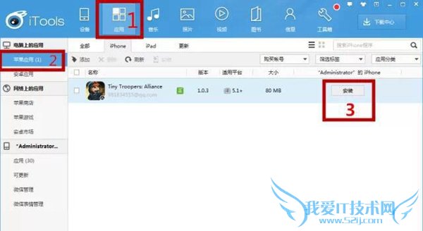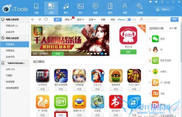 当然,用户也可以采用iTunes下载,当应用程序下载完成后,采用第三方软件,如iTools进行安装。