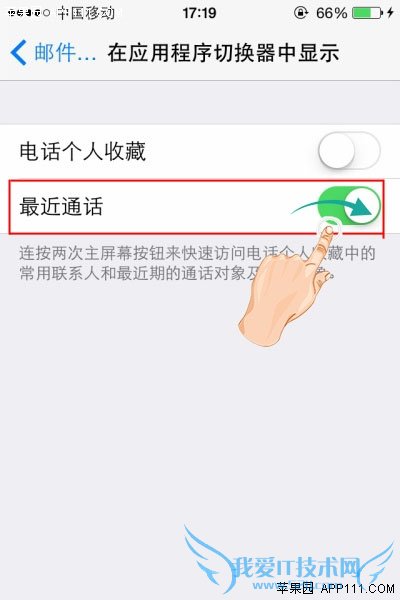 第三步,“在应用程序切换器中显示”栏目中,开启“最近通话”功能,即可。