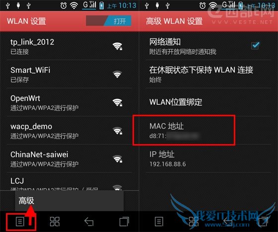 在“设置 > WLAN设置”里面,点击“菜单键”,会弹出“高级”选项。里面就能查看到MAC地址。