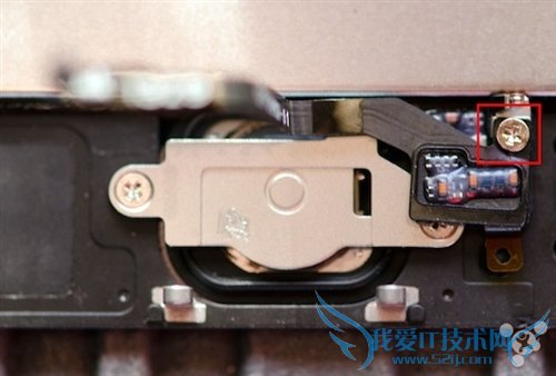 第一步,转移 Touch ID 传感器和 Home 键总成。 1,拧开图中圈出的这枚螺丝钉,用的还是 #000 十字螺丝起子。在它的下面有块非常小的金属片,你需要记住这块金属片哪一面向上,并保持它压着电线,免得电线会弹起来。