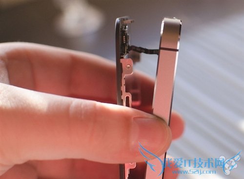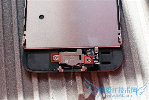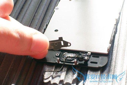 2,放下工具,现在用手扶着电线,可以慢慢把小金属片掀开了。还有一块大金属片保护着 Home 键,拧开上面的两枚螺丝钉,把大金属片掀开。