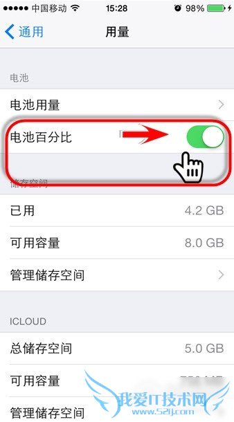 第2步:点击电池百分比右方的滑块并向右拖动,即可开启该项显示功能。