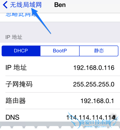 4、在 DNS 一栏输入 114.114.114.114 或 8.8.8.8 地址,可以换着试一下。好了以后点击左上角的“无线局域网”按钮返回,如图所示