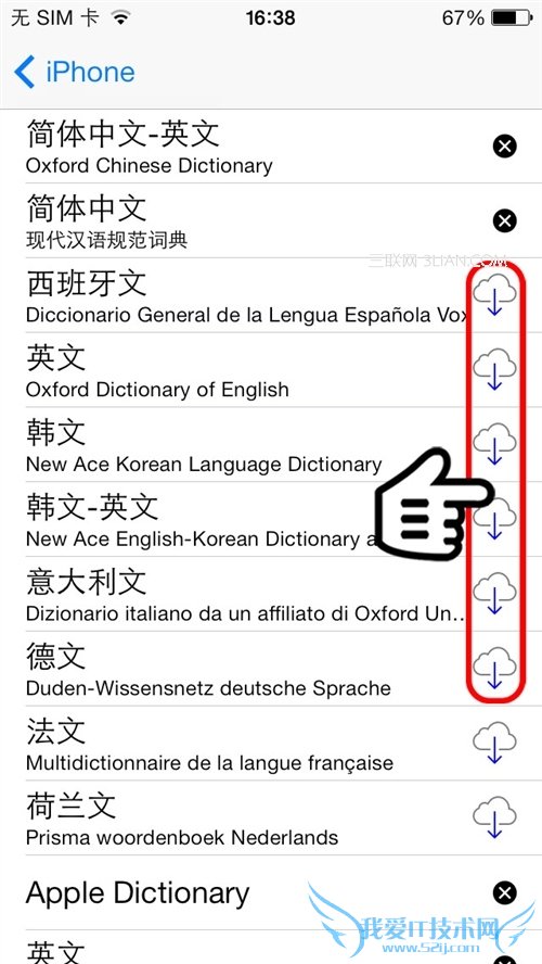 iOS7系统还支持添加更多的字典哦,点击上图左下角的“管理”,选择你需要的字典下载吧: