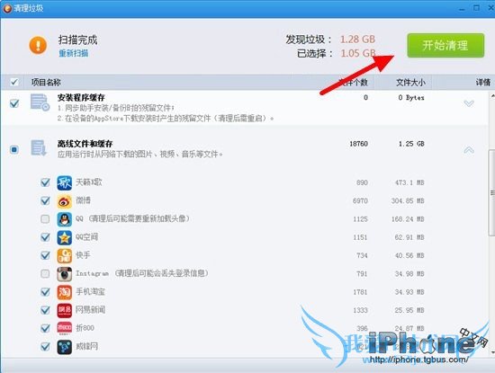 4、接下来同步助手会扫描iPhone6手机中的垃圾文件,等待扫描完成后,就可以看到有哪些可以删除的缓存垃圾了。默认是推荐的清理项,你也可以自行选择清理哪些,最后点击右上角的【开始清理】即可,如下图所示。