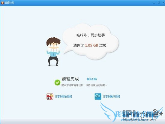 5、等待清理完成即可,最后就可以看到同步助手成功为您的iPhone6清理了多少垃圾缓存文件,如下图所示。