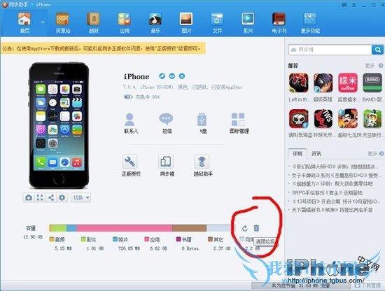 2、将iPhone6或者iPhone6 Plus通过数据线连接电脑,然后打开“同步助手”,之后工具会自动识别到iPhone6手机,初次连接电脑需要先为iPhone6安装驱动,然后就可以看到如下操作界面了,点击底部容量后面的【清理垃圾】按钮,就可以进行清理缓存操作,如下图所示。