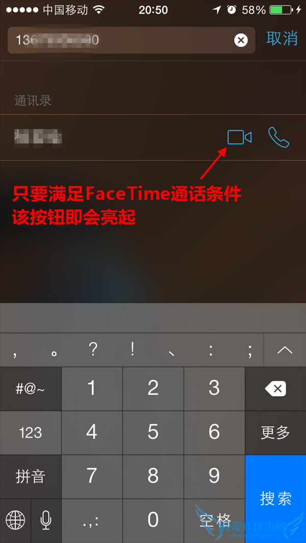 进入FaceTime操作界面后,可以从手机通讯录调出联系人,也可自行输入电话号码来呼叫对方。如果对方满足FaceTime的条件,那么视频通话的按钮即会亮起,点击即可拨通电话。
