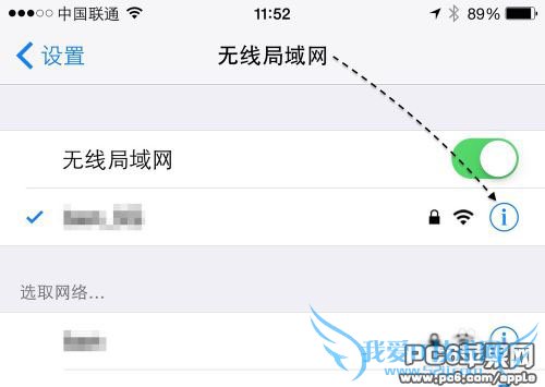 接着请在无线局域网列表里,点击当前已经连接好的无线右侧的“信息”图标,如图所示