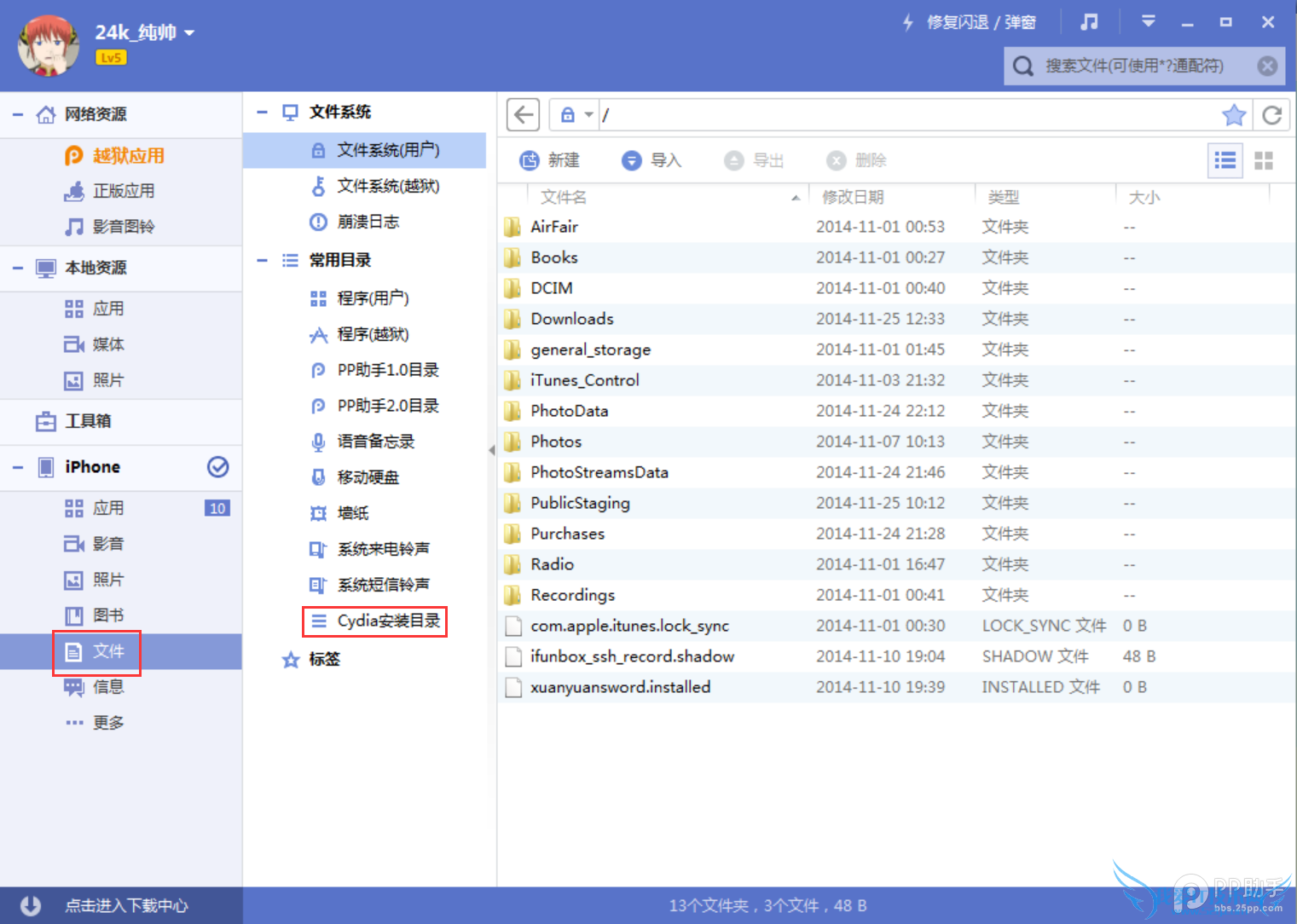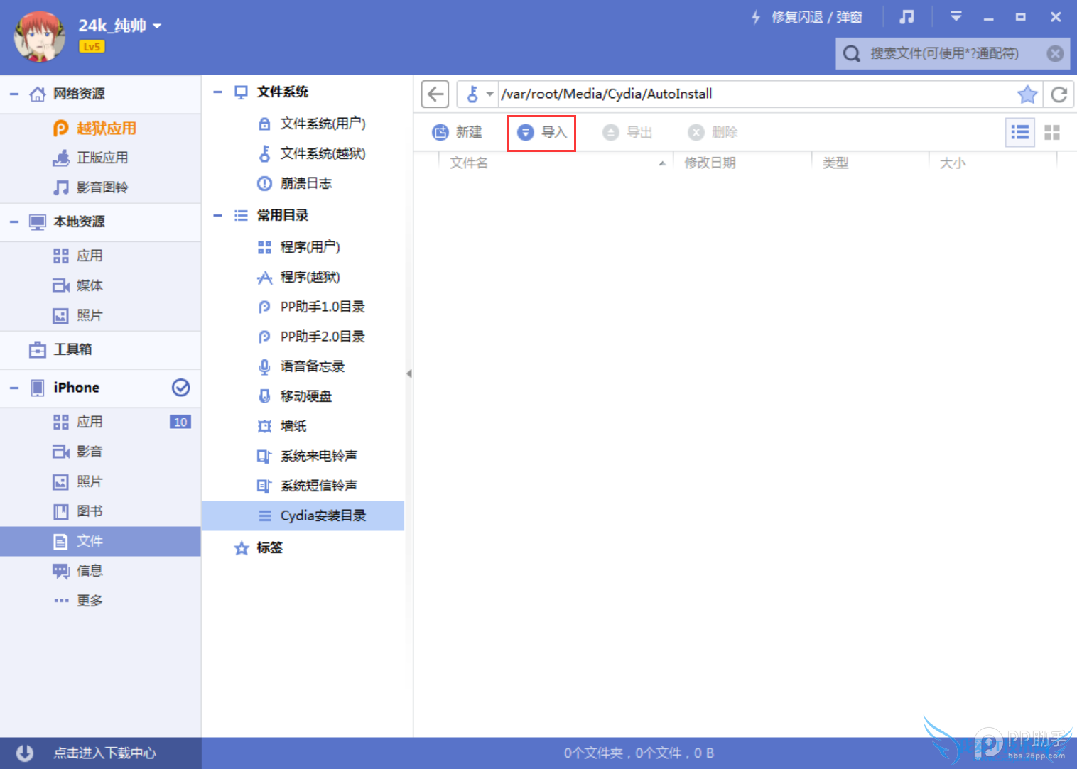 一、电脑上安装最新版本的PP助手,然后打开【文件】-【cydia安装目录】: