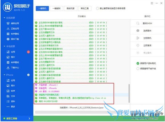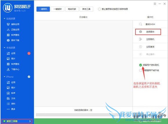 2、下载好固件之后,点击左下角“爱思工具箱”里的“一键刷机”,之后点击右侧“选择固件”,选择刚才下载好的固件;刷机时勾选“保留用户资料刷机”,刷机完成后手机资料不丢失。