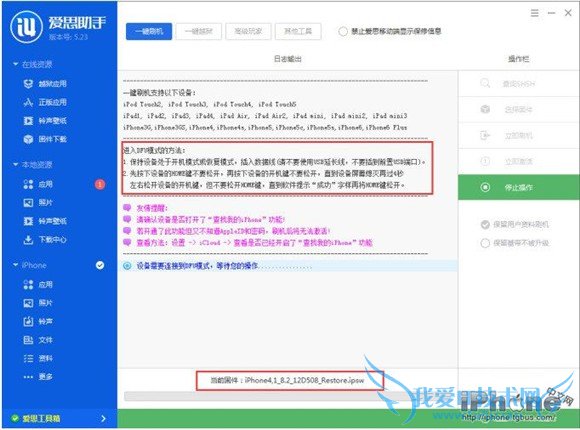3、然后再点“立即刷机”,此时根据提示进入DFU模式。DFU模式是需要在手机上手动操作进入的。