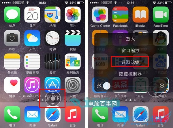 六、最后连续点击主屏幕Home键,便可激活缩放功能呢,在其系统主界面便可看到缩放快捷键的图标,在弹出的菜单页面中,我们点击选取滤镜,然后再选择弱光,再点击主屏幕上空白的地方,发现夜景模式开启了,效果是不是非常明显,如下图所示。
