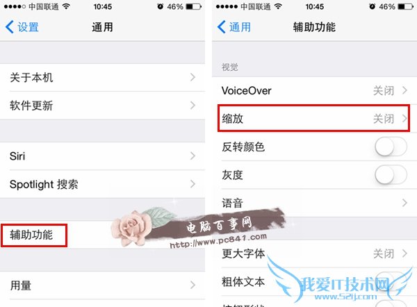 二、然后在iOS8通用设置中,我们再找到“辅助功能”页面,在里面就可以看到“缩放”页面了,右侧显示关闭状态,如下图所示。