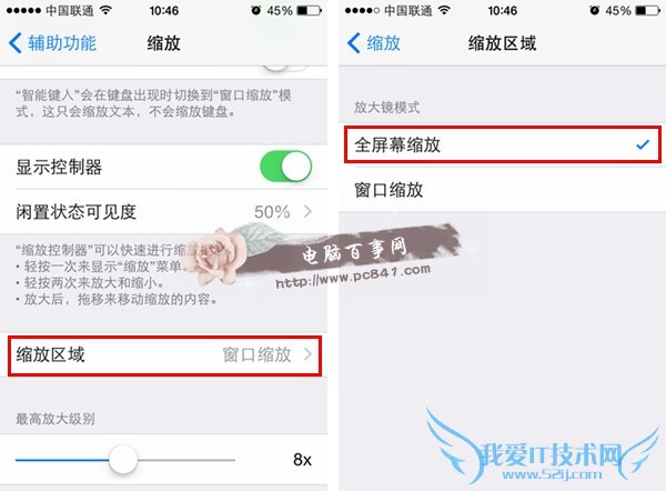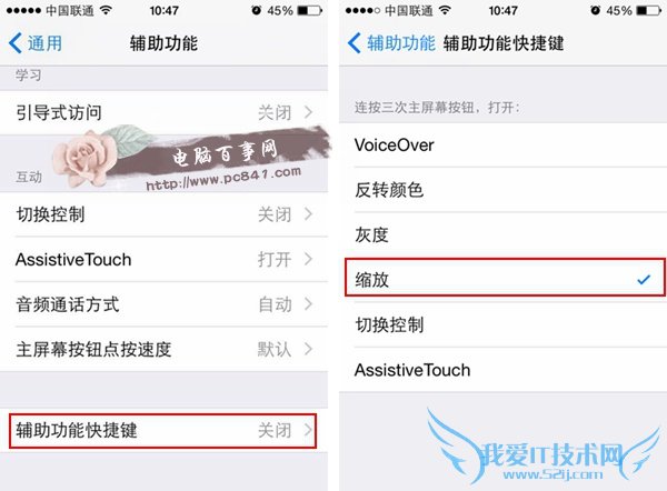 五、选择完毕之后,返回到“辅助功能”,在其页面下方找到“辅助功能快捷键”,默认状态是关闭的,将其打开,然后进入辅助功能快捷键的激活页面,目前有Voice Over、翻转颜色、灰度、缩放、切换控制、Assistive Touch等功能,这里选择缩放,如下图所示。