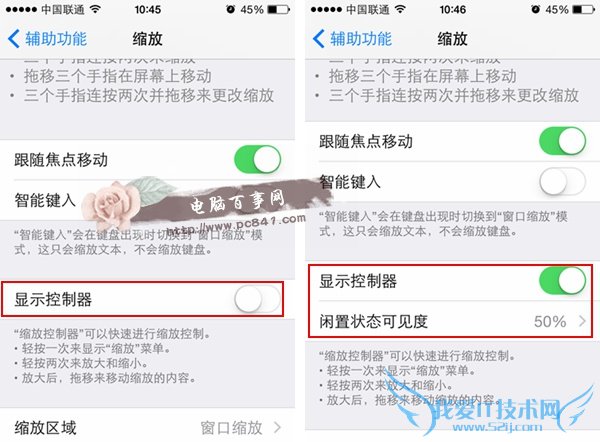 三、接下来点击进入到缩放设置页面,,此时会看到“显示控制器”目前默认处于关闭状态,点击开关按钮进行打开,这时闲置状态可见度默认为50%,如下图所示。