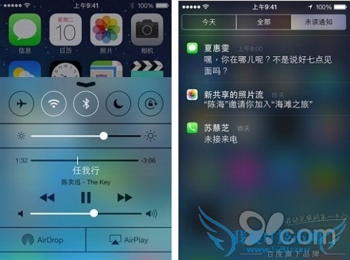 首先,通知中心是之前便有的手势操作,从屏幕顶部向下滑动即可开启;而控制中心则是iOS 7中新增的一个元素,操作与通知中心正好相反,需要从屏幕底部向上滑动。