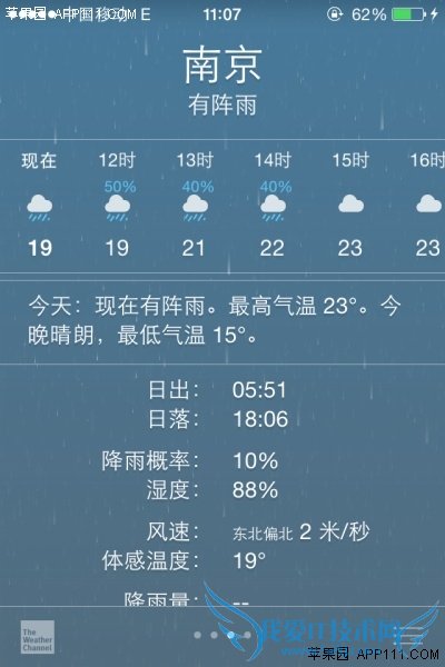 第二步,在天气应用页面,从下往上滑动屏幕,就可以看到当天较为详细的天气预报,日出、日落、降雨概率、湿度等数据。