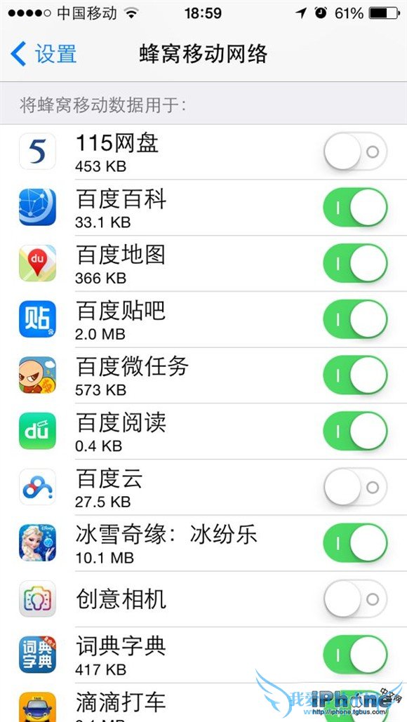 —— 下面就是“将蜂窝移动数据应用于”一长项了,这里可以将你需要用到流量数据的软件打开,而不需要用流量数据的软件应用就可以关闭了,这样就不怕偷跑流量了。