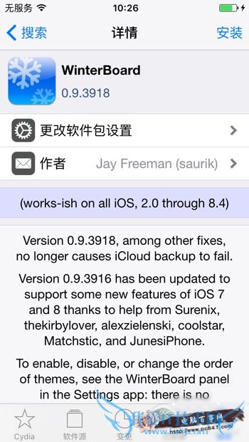 2.设备越狱之后,打开Cydia,搜索安装主题美化插件【Winterboard】