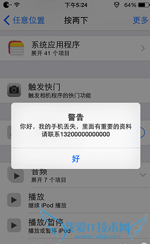 Activator—任意位置——随便点击一个手势进入(我们暂以双击状态栏为例)—右上角更多—显示信息提示—(自己填写自己的联系方式等如:您好,我的手机丢失,里面有重要的东西请联系132000000000)—完成。
