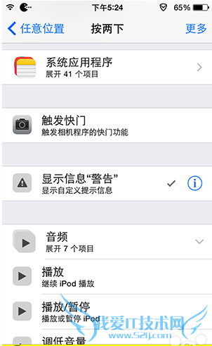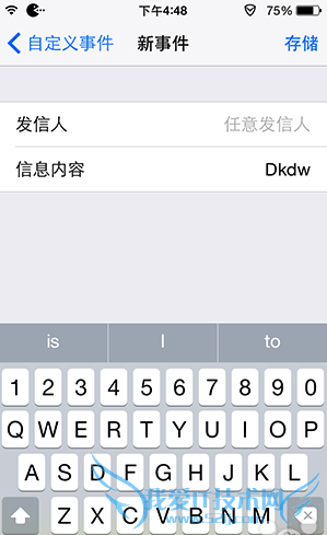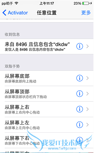 进行【设置】-【Activator】-【任意位置】,点击右上角的更多,则能够看到一个【收到信息】的选项,在其中设置发信人以及信息内容,我们暂时将信息内容设定成“dkdw”,确定保存返回至【任意位置】界面,一直往下翻,我们就能够看到你刚才的收到信息的设置。