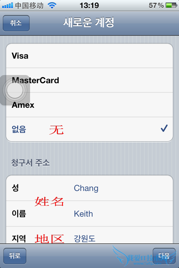 信用卡那里也就是我也无的那里选择打钩,姓名写自己的(我的只是给大家参考)地区那里选第二个,也就会我选的这个(韩国江源这个地方)