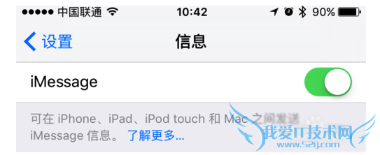 4、当然要发送蓝色背景的信息时,是需要具备有一定的条件才可以。首先自己必须是使用苹果 iPhone 手机,并且在【设置-信息】里打开了 iMessage 功能服务。如下图所示,只要当前你所使用的是 iPhone 手机,便可以自己打开这个功能。